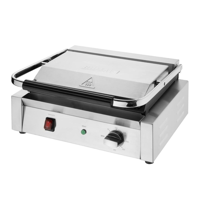 La combinaison d'une construction robuste en acier inoxydable et de plaques de cuisson en fonte extrêmement résistantes font du gril de contact bistro Buffalo un excellent choix pour tout traiteur professionnel. Conçu pour une utilisation quotidienne constante, le grill est à la fois puissant et facile à utiliser. Des commandes simples permettent une régulation précise de la température, tandis que le bac de récupération intégré empêche l'accumulation de graisse et autres restes alimentaires. Une fois le service terminé, le gril est facile à nettoyer. Fourni avec un grattoir de gril pratique